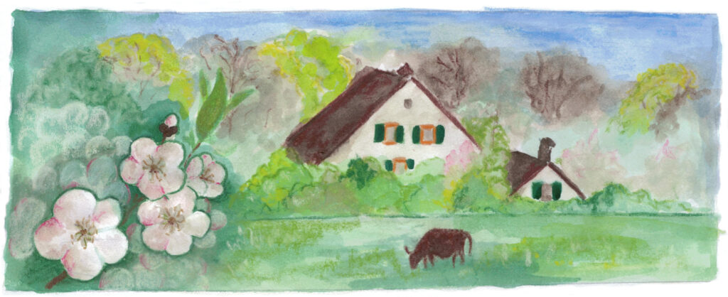 Der Frühling wirbelt uns zur Zeit eine weiss-wilde Mischung aus Schneeflocken und Blütenblättern ums Haupt. Zwischen Frostschutz und Frühlingsgefühlen ist beinahe der ganze Hof umringt von Blütenwolken der Steinobstbäume.